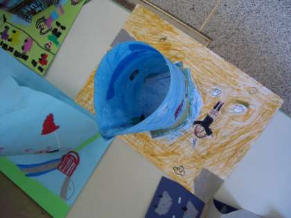 普段は画用紙の表面に絵を描いていますが、今回は画用紙をさまざまな工夫を用いて立たせ立体的な作品に仕上がっています。画用紙の裏にも絵が描かれていますので、よく見てくださいね。