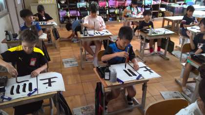 書写の時間で『土』という字を書いています。