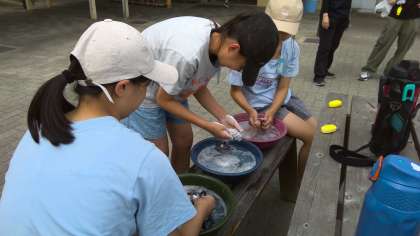 石けんでくつしたの手洗いをしています。