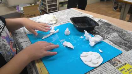図工の時間です。「かみねん土をつかってすきなものをつめこもう」