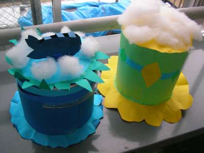 2年生が図工の時間にすてきな帽子を作って見せに来てくれました。海のクジラをイメージした物と宝石をイメージした帽子です。かぶった姿もばっちりでしたよ。