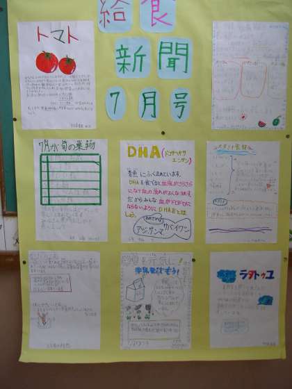 7月の献立を見ながら,各々が選んだ内容で新聞形式にまとめ掲示しました。