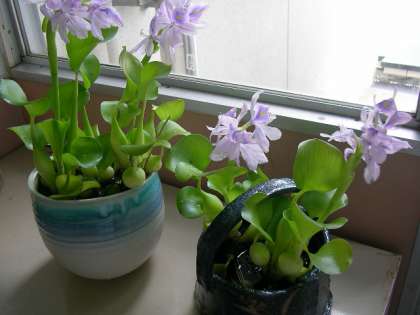整理した「ホテイアオイ」別名「ウォーターヒヤシンス」の美しい花がもったいなので少しだけ職員室前に飾りました。