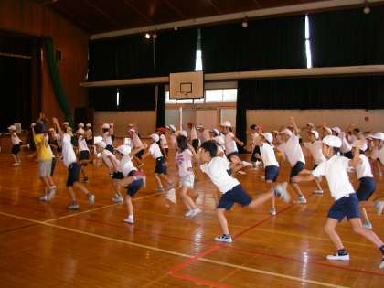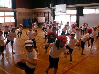講堂から威勢のよいかけ声が聞こえてきます。中学年の運動会種目を一生懸命練習していました。