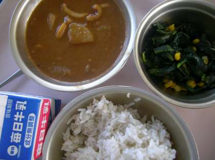 麦ごはん,牛乳,シーフードカレー,ほうれん草のソティ