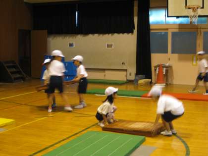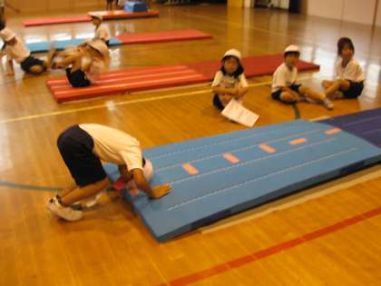 運動会がすんで,体育では「マットあそび」に取り組んできました。グループの友だちと協力をして準備をし,すぐに「体ならしの運動」を始めます。指示をされなくても自分たちで進めていける1年生です。