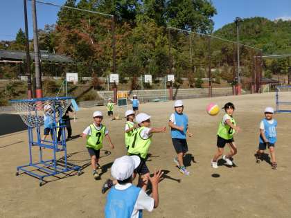 2年生は,体育でパスゲームの学習をしています。パスゲームとは,パスでボールを運んで,バスケットボールのお化けのようなゴールにシュートして,チームで得点を競うゲームです。