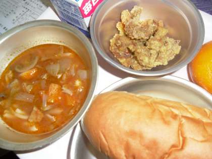 ミルクコッペパン,牛乳,スパイシーチキン,ミネストローネ,みかん