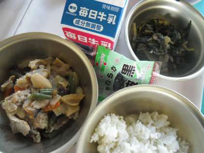 麦ごはん,牛乳,煮付け,ほうれん草と白菜のごま煮,黒大豆