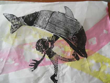 凸凹模様のある紙などを使って,こんな生き物がいたら楽しいだろうと想像しながら版に表します。多目的教室に作品が乾かしてありました。その中から少し紹介したいと思います。