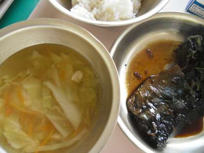 胚芽米ごはん,牛乳,にしんの煮つけ,ほうれん草のおかか煮,キャベツの吉野汁