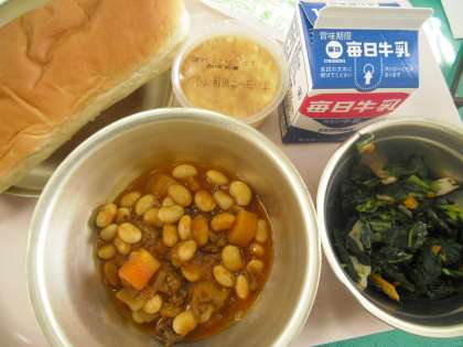 ミルクコッペパン,牛乳,大豆と牛肉のトマト煮,ほうれん草のソティ,焼きプリン