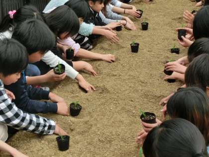 心配していた天気も何とかもち,まずは一安心。「間引き」の仕方や「ポットから苗の取り出し方」を丁寧に教えてもらい,ひとつひとつ「大きく育て」と願いながら注意深く植えました。