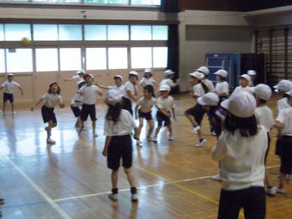 1年生1・2組合同でドッジボールをしました。早くボールを投げたり、外野へパスするため高く山形に投げたり。初めてのドッジボールという子もいましたが、ルールがわかるとキャーキャー騒ぎながら走り回り、とても楽しそうな様子でした。