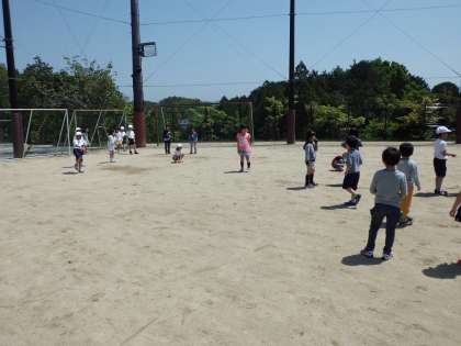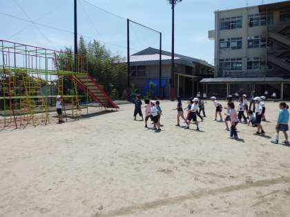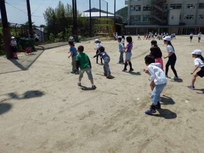 中間休みに、1・2年生のなかよしペアで赤白青の3組にわかれてだるまさんが転んだをしました。短い時間ですが、良いお天気の中でとても楽しめました。