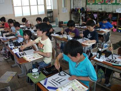 まずは、道具の名前や書くときの姿勢など、説明をしっかり聞きました。その後、さっそく太筆を使って練習をしました。筆を立てて持ち、筆先の力加減に気をつけて細い線や太い線,渦巻き線を書きました。子どもたちは筆先に神経を集中させながら筆の感触を味わっていました。