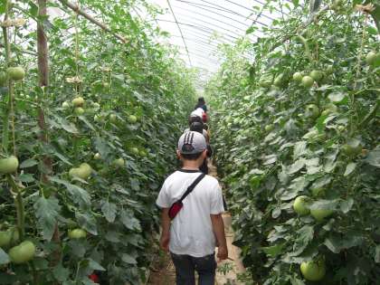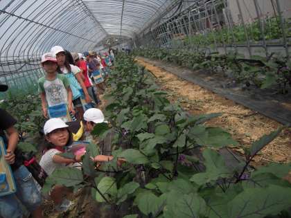 2年生の今日の生活科では、地域の方にお世話になって畑を見に行きました。見せていただいたビニールハウスではナスやトマトなど夏の野菜が育てられています。