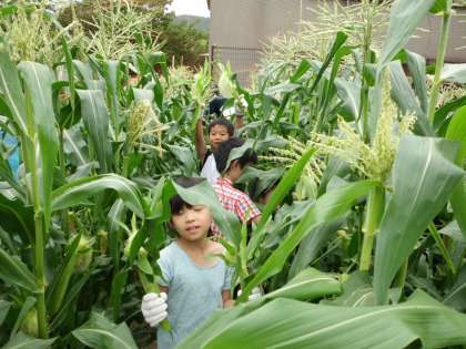 2年生がスイートコーンの摘果(てきか)をしてくれました。摘果とは一つの果実に、より多くの栄養が行き届くように、小さいほうの果実を取ってしまうことです。一株に一つのコーンと制限して、一つ一つがより大きく、おいしくなるように育てます。