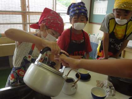5年生は家庭科でお茶をいれました。お湯を沸かし,急須にお茶を入れて,湯呑に順に注ぎます。子どもたちは,自分たちの入れたお茶をのみながら,「おいしいね。」と口々に話していました。