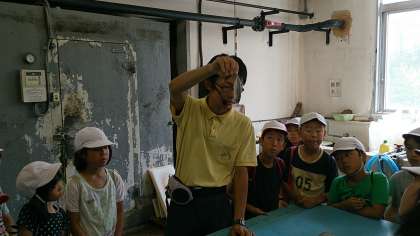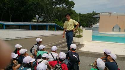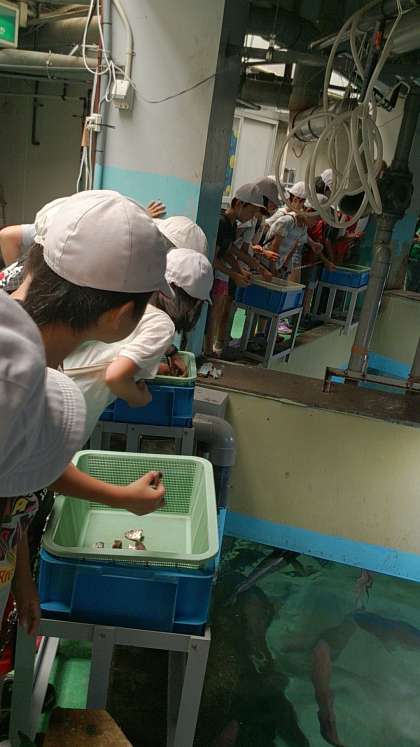 マリンランドに到着です。職員さんから飼育についてのお話を聞き,さっそく水族館の裏側へ。サメなどの泳いでいる水槽の上から,えさやり体験をしました。