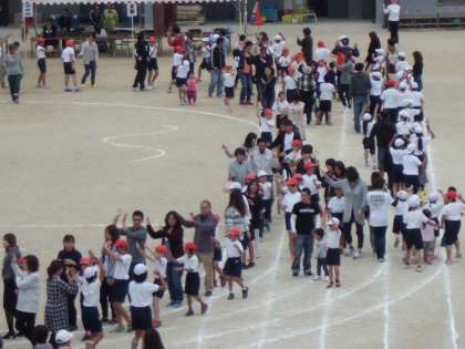 「鷹峯シャンソン」 60年以上前にこの鷹峯でつくられた曲と踊りを、地域の方々にお世話になり,3年前に運動会のプログラムとして登場させました。今では全校児童と保護者,地域の皆様にも参加していただき踊っています。最後にするジャンケンがとても盛り上がります。ご参加いただいた皆様,有難うございました。