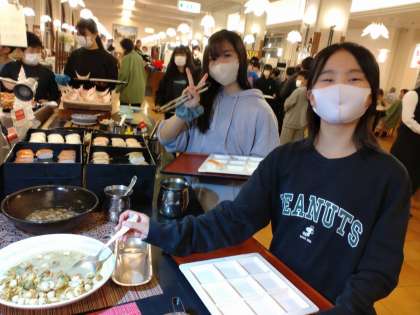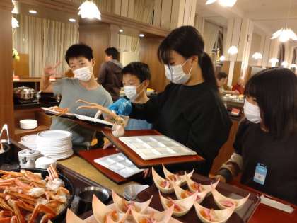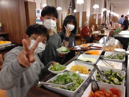 夕食はバイキング形式で、色とりどりの料理が並び、子どもたちは笑顔で好きなメニューを選んでいました。
