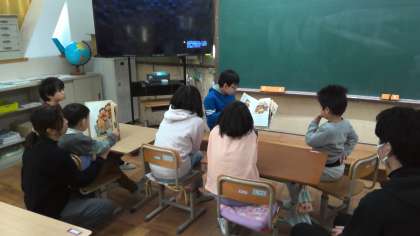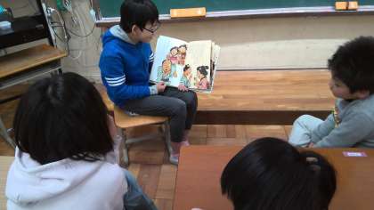 6年生が、おなじみの落語のえほん『じゅげむ』(川端誠さく)を読んでくれています。