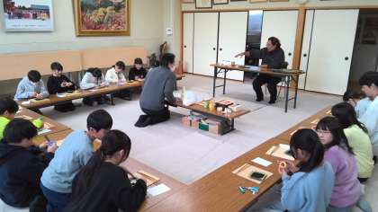 京都府仏具協同組合様からゲストティーチャーをお招きし、金箔貼り体験をしました。