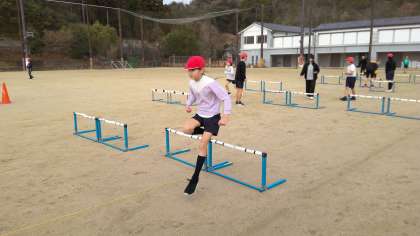 体育の授業で、40メートルのハードル走をしています。