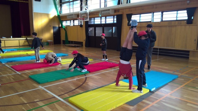 側転の連続や閉脚から開脚の後転、倒立から後転などの連続の技に挑戦しています。
