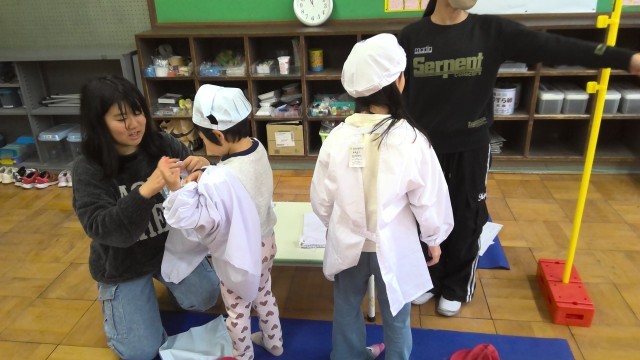 給食は、ぼうしとマスク、エプロンをつけて配膳します。
