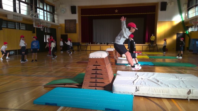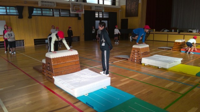 体育の授業で、とび箱をしています。