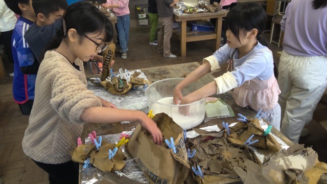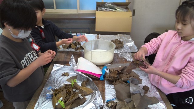 ダンボールをひたして、思い思いのかたち作っています。