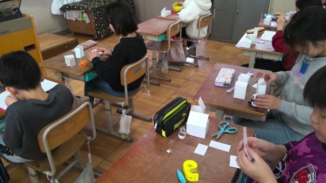 算数の授業で、いろいろな形の箱を作っています。