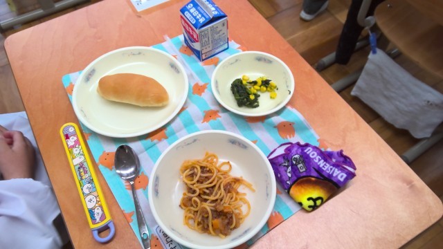 入学祝いの献立です。メニューは、スパゲッティのミートソースに、ほうれん草のソテー、小型コッペパンと牛乳です、
