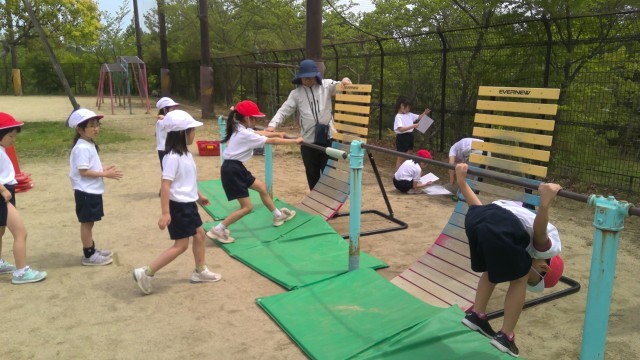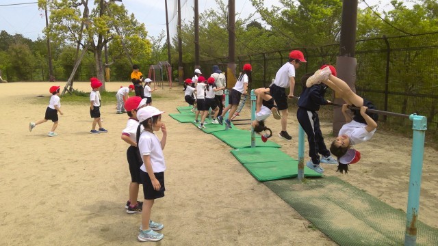 体育の授業で、てつぼうをしています。