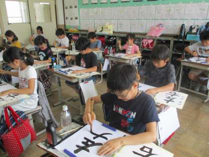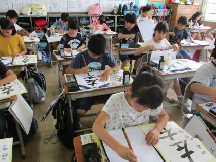 横画やはらいの長さに気をつけて,集中して「左右」の作品を仕上げました。