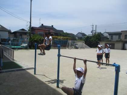 体育の学習では,てつぼう運動をしています。友達が新しい技を成功させているのを見て,「自分もやってみようかな…」とチャレンジする子どももでてきました。