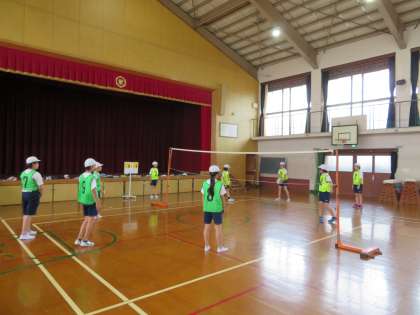 6年生の体育では,ソフトバレーボールをしています。みんなでボールをつなぐことが難しいようですが,声をかけ合ってがんばっています。「ごめん」や「ドンマイ」,「ナイスサーブ」などの声が聞こえてきます。