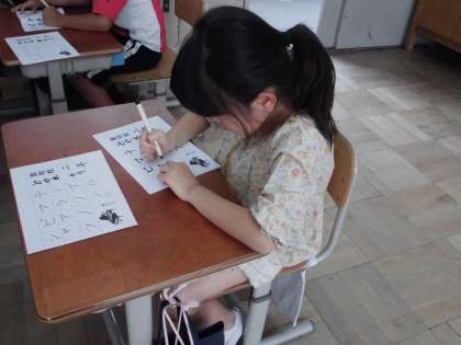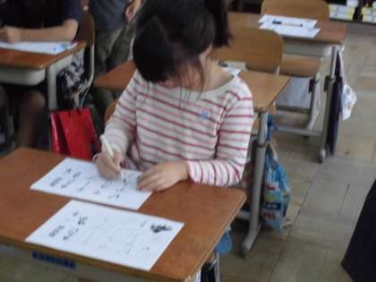 フェルトペンを使って,かたかなの言葉を書きました。お手本をしっかり見て,文字の形に気をつけて書くことができました。