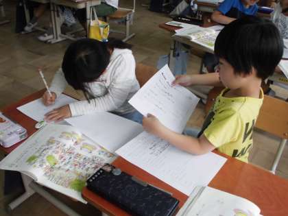 「だいじなことをおとさずに,まいごのお知らせをしよう」をめあてに,二人組でまいごのお知らせをしました。友達がメモをとりやすいように,ゆっくり間をとりながら話している子どももいました。学習した話し方,聞き方のポイントをいつも意識できるといいですね。