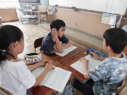 国語科「きいて,きいて,きいてみよう」では,友達とインタビューをし合ったり,それを記録して報告したりする学習をしています。相手の興味のあることや頑張っていることについてよく分かるように,尋ね方などを工夫して聞いています。