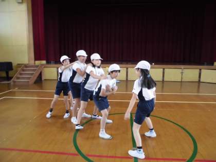 体育では,「二人ずもう」,「ことろことろ」,「ろくむし」という遊びをしました。「ことろことろ」は,オニ以外の人は列車のように肩に手をおいて列をつくり,オニは一番後ろの人をタッチするという遊びで,「ろくむし」は,2人がボールを投げ合っているところを走り抜けて,2つの円の間を6往復すれば勝ちという遊びです。どちらの遊びも簡単なようで,俊敏性や瞬発力が必要な運動です。みんなルールをしっかりと理解して,とても楽しんでいました。