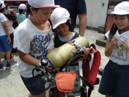 空気呼吸器などの消防衣の重さにもびっくりです。2本のホースが入ったホースバックをかついで,「これを持って階段をかけ上がるなんて無理!」とみんな言っていました。