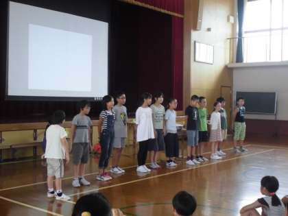朝会で,委員会ごとに知らせたいことなどを全校に向けて発表をしました。5年生も委員会に仲間入りし,初めての発表です。劇やクイズなどをまじえて発表を工夫していました。練習の成果を発揮し,大きな声で一生懸命役割を果たしていました。