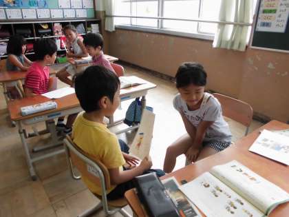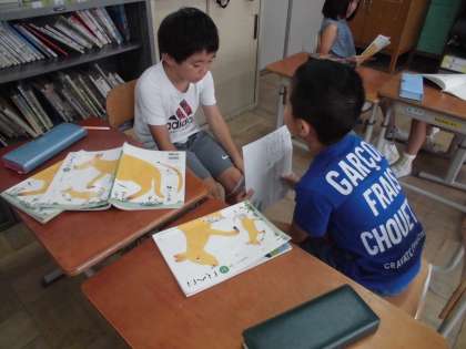 「ミリーのすてきなぼうし」を読んで作ったお話クイズを二人組で出し合いました。後の振り返りでは,「教科書をみなくても答えがすぐにわかりました。」「九万九千九百九十九円のところのクイズが多かったです。」「おうちの人にもクイズをやってもらいたいです。」などの感想を発表していました。