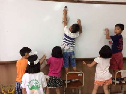 1年生にとって,初めての夏休みです。入学してからこれまで,あっという間でしたね。夏休み前の最終日には,これまで使ってきた教室や廊下をピカピカにしよう!と,全校で大掃除をしました。いつもよりも長い時間でしたが,汗びっしょりになりながらも,時間いっぱい一生懸命掃除をすることができていました。途中でやめずに,最後までやり切ることのできた1年生,かっこよかったです。