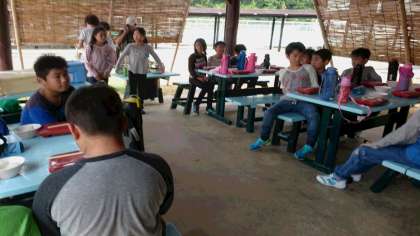 芝生で遊んで、着替えて磯観察、戻ってプール、靴を洗ってまた着替え、長い午前中がやっと終わり、昼ごはんです。みんな元気、もりもり食べています。