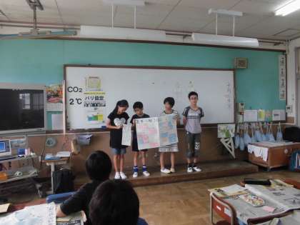 気候ネットワークの方に来ていただき,夏休みに取り組んだエコライフの振り返りをしました。できたことと,できなかったことをグループで交流し,これからのエコライフの目標を考えました。グループごとにまとめたことを発表し,聞き合いました。