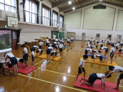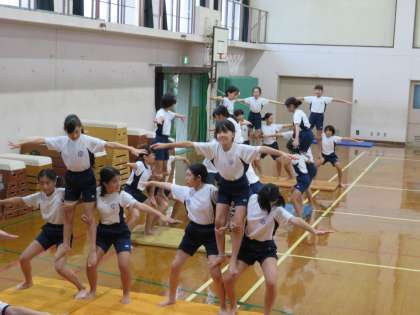 運動会が近づいてきました。高学年の団体演技も大詰めです。体育館から運動場に移動し,組体操の練習をしています。友達に声をかけたり,足が痛くてもこらえたり,一人一人がみんなのために力を発揮しています。